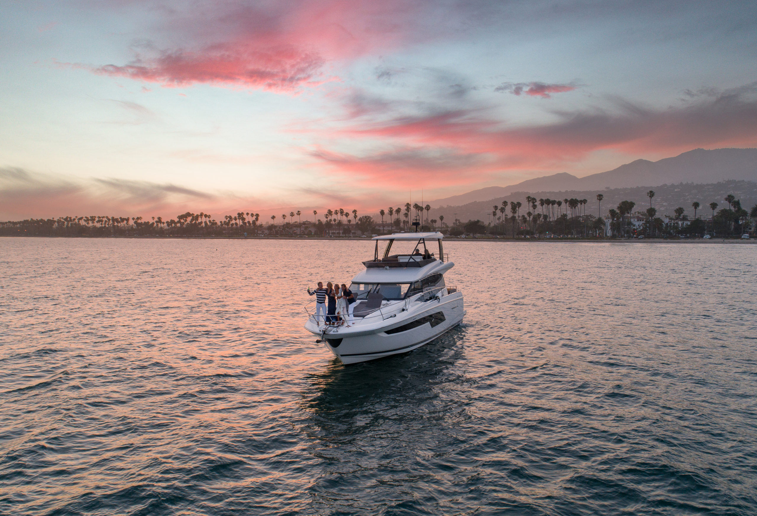 Dream Weaver is a luxurious yacht for charter in Santa Barbara. An award-winning, dynamic cruising masterpiece from the luxury French yacht designer Prestige, Dream Weaver features an extremely spacious flybridge and multiple areas for relaxing in comfort. Her intensely bright saloon features picture book large windows and modern, stylish furnishing to produce a warm, welcoming interior feel. Outside, there are numerous places to bask in the California sun and take in Santa Barbara’s beautiful coastline, including sun beds across the full length of the bow, a large L-shaped seating area at the stern, and multiple lounging configurations on the upper deck. With chic Mediterranean styling from the immaculately presented teak decks to luxurious furnishings throughout, Dream Weaver is the perfect way to cap a visit to the beautiful coastal splendor of Santa Barbara.
